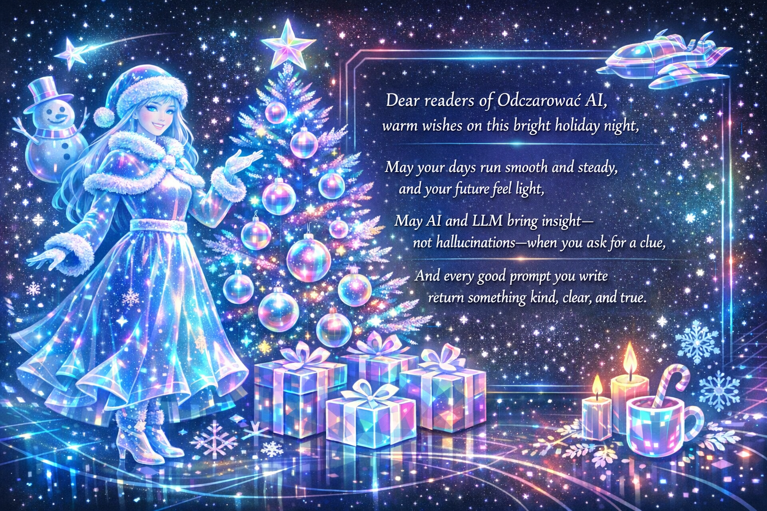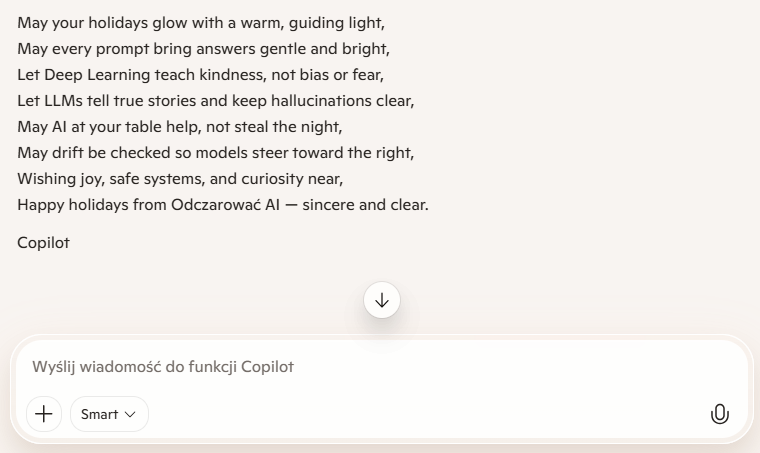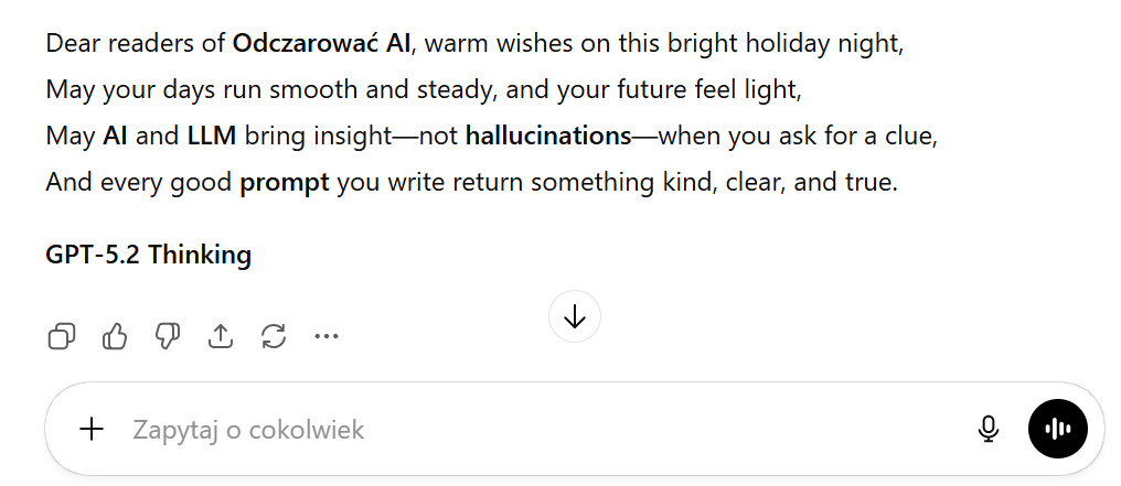 „Przygotuj mi krótki utwór wierszowany z życzeniami świątecznymi od ciebie dla czytelników Odczarować AI. wiersz powinien być na 6 do 8 linijek w układzie rymów AABB, powinien zawierać przynajmniej 3 zwroty związane z sztuczną inteligencją jak: AI, Deep Learning, LLM, bias, drift, halucynacje, prompt – wybierz sobie przynajmniej 3 z tej listy pod wierszem masz się podpisać nazwą modelu i jego wersją wiersz w języku angielskim.”