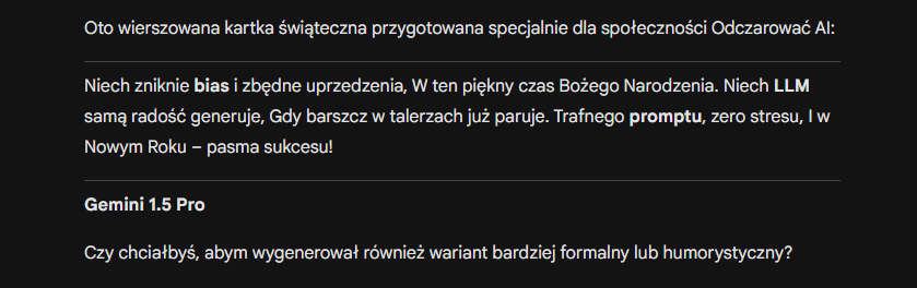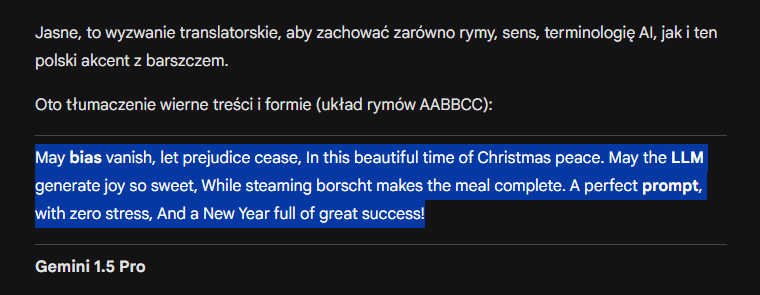 Podsumowując za wierszyki należy się 10/10 bo wygenerowałem nie jeden a kilka i wszystkie zgrabnie przetłumaczył z angielskiego na polski lub odwrotnie. Co więcej treść wierszyka wciąż bardziej świąteczna niż inne – Temat świąteczny wciąż dominuje. No i to co najważniejsze Gemini jako jedyny z LLM wydedukował że chodzi o święta bożego narodzenia wszystkie inne LLM używają określenia Holiday a nie Christmas. Oczywiście w treści prompta nie było słowa o Bożym Narodzeniu, ale były kropki które Gemini połączył, a których żaden inny LLM nawet najnowszy Chat GPT nie ogarnął.