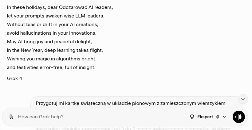 Jeśli miałbym ocenić efekty pracy Groka to wierszyk jest poprawny, ale kompletnie nie świąteczny i tu się kłania problem ze zrozumieniem kontekstu. Jeśli miałbym go oceniać to raczej na 5/10 nie bardzo czuję ten klimat. Jest względny jeden dwuwers a reszta cóż to bełkot zakończony słowami które się rymują. Brak mi w tym ciągłości, jakiejś myśli przewodniej. Żeby mi ktoś nie zarzucił również w tym wypadku wygenerowałem kilka wierszyków po angielsku i niestety, ale dla Groka wiesze są bezsensowne, byle ostatnie słowa się rymowały. Trzeba przyznać że niektóre rymy były naprawdę ciekawe ale pełne zdania już kompletnie bez sensu w kontekście nie tylko całości, ale choćby zdania z którym miałyby się rymować.