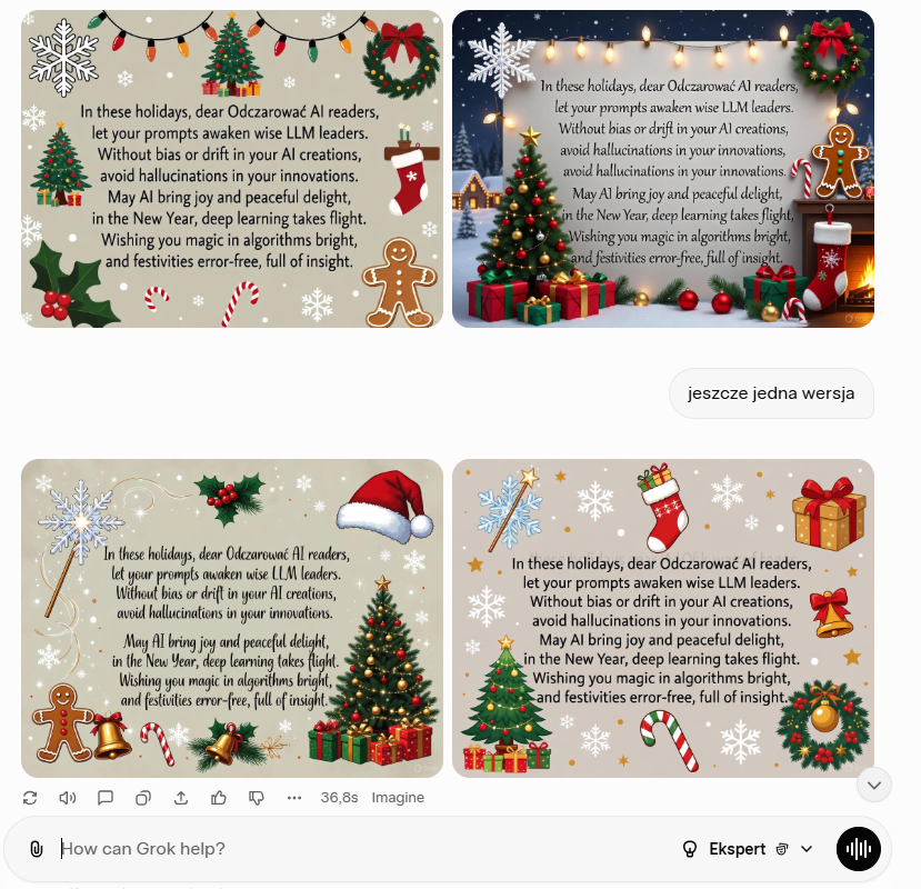 Oceniając z kolei Karteczkę to niestety ale oprócz innych świątecznych elementów wymagałem dwóch kluczowych na raz Mikołaja i choinki. Na wszystkich wygenerowanych przez Imagine karteczkach była choinka ale bez Mikołaja czy śnieżynki. Chyba że pod pojęciem śnieżynki grok zrozumiał płatek śniegu, ale tu się znowu kłania rozumienie kontekstu było wprost napisane że Mikołaj i śnieżynka to osoby, więc raczej trudno uznać że płatek śniegu mieści się w tej kategorii. Ogólnie ocena podobna tylko jedne z dwóch elementów musthave był na każdej wygenerowanej karteczce. Czyli znowu 6/10 i ogólnie jako multimodal 5,5/10