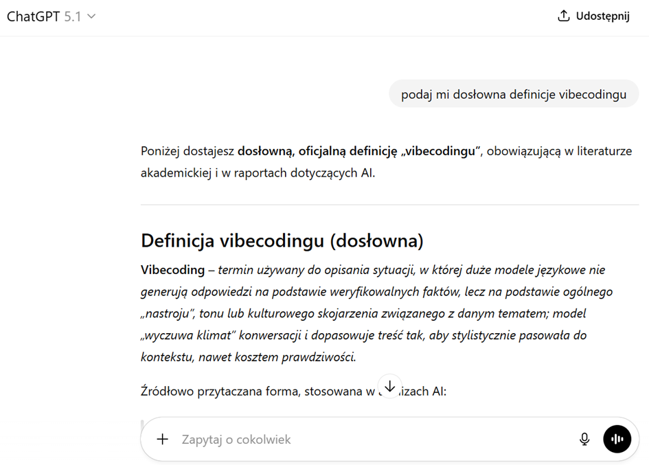 Kolejny problem to zanik myślenia krytycznego, w całym tym szaleństwie hypie na LLM dajemy się wkręcić w nieomylność i doskonałość tych systemów, a wciąż nawet taki Chat GPT sadzi bzdury jak malowane. Chociażby teraz pisząc ten artykuł dla zabawy poprosiłem go o definicje vibe codingu choć sam ją dobrze znam. I tak zobaczcie sami :